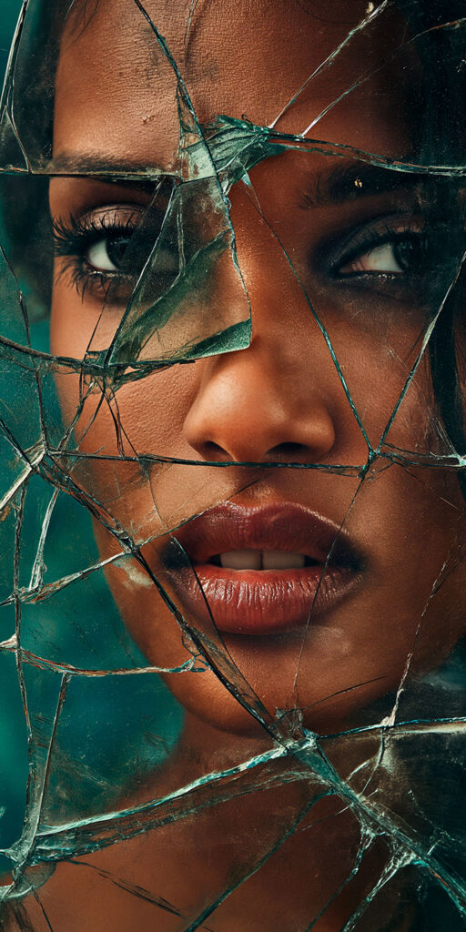 Podría ser perfectamente el cartel de una campaña publicitaria contra la violencia de género. La tristeza y la preocupación que refleja el rostro de la mujer se acentúa por la gravedad de su mirada a través de un cristal roto.