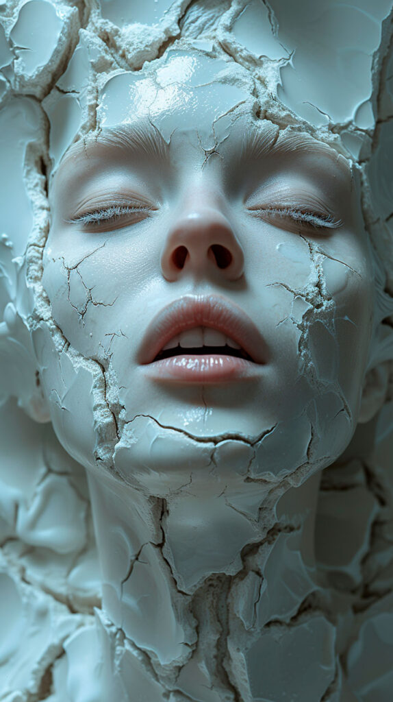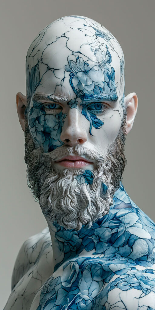 Este busto de un hombre completamente albino y tez marmolada no deja impasible a nadie. El resultado final está mas cerca de una escultura renacentista mezclada con el arte cerámico chino que de una campaña de modelos con tatuajes.